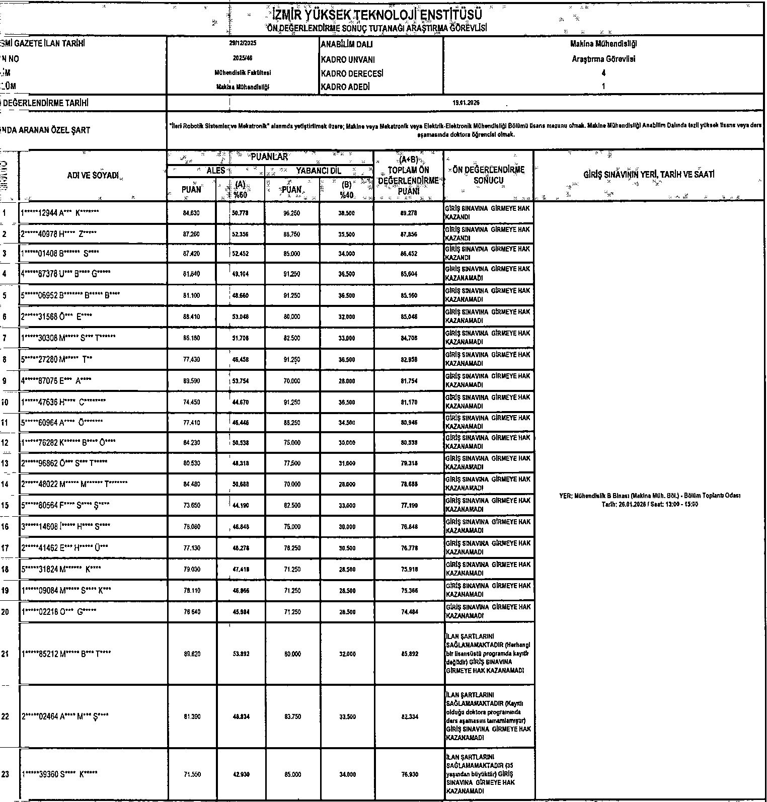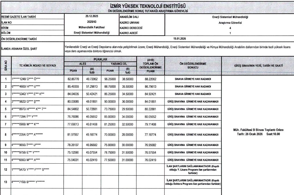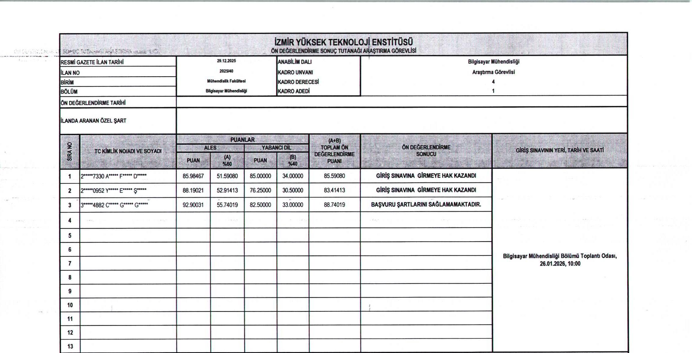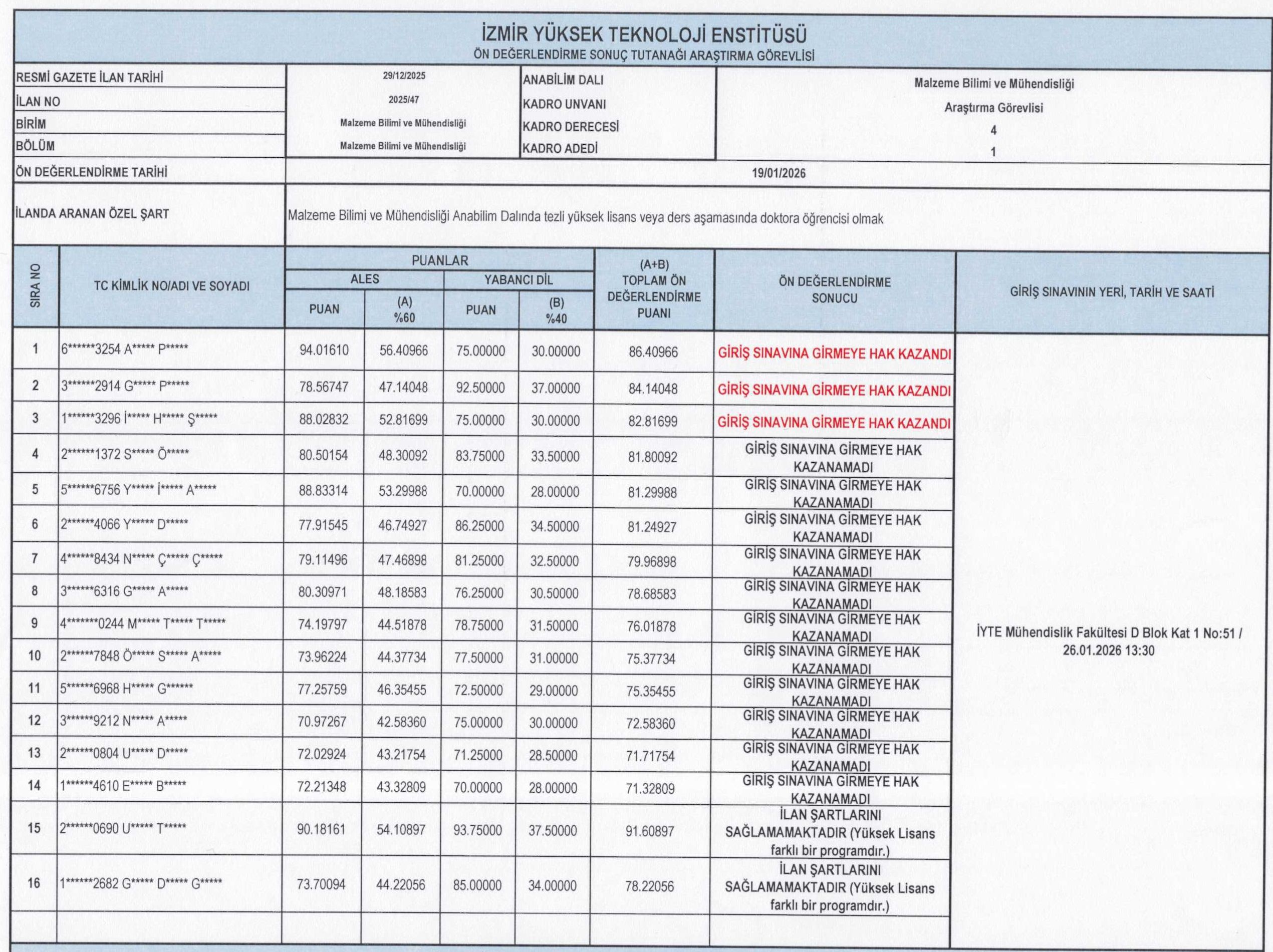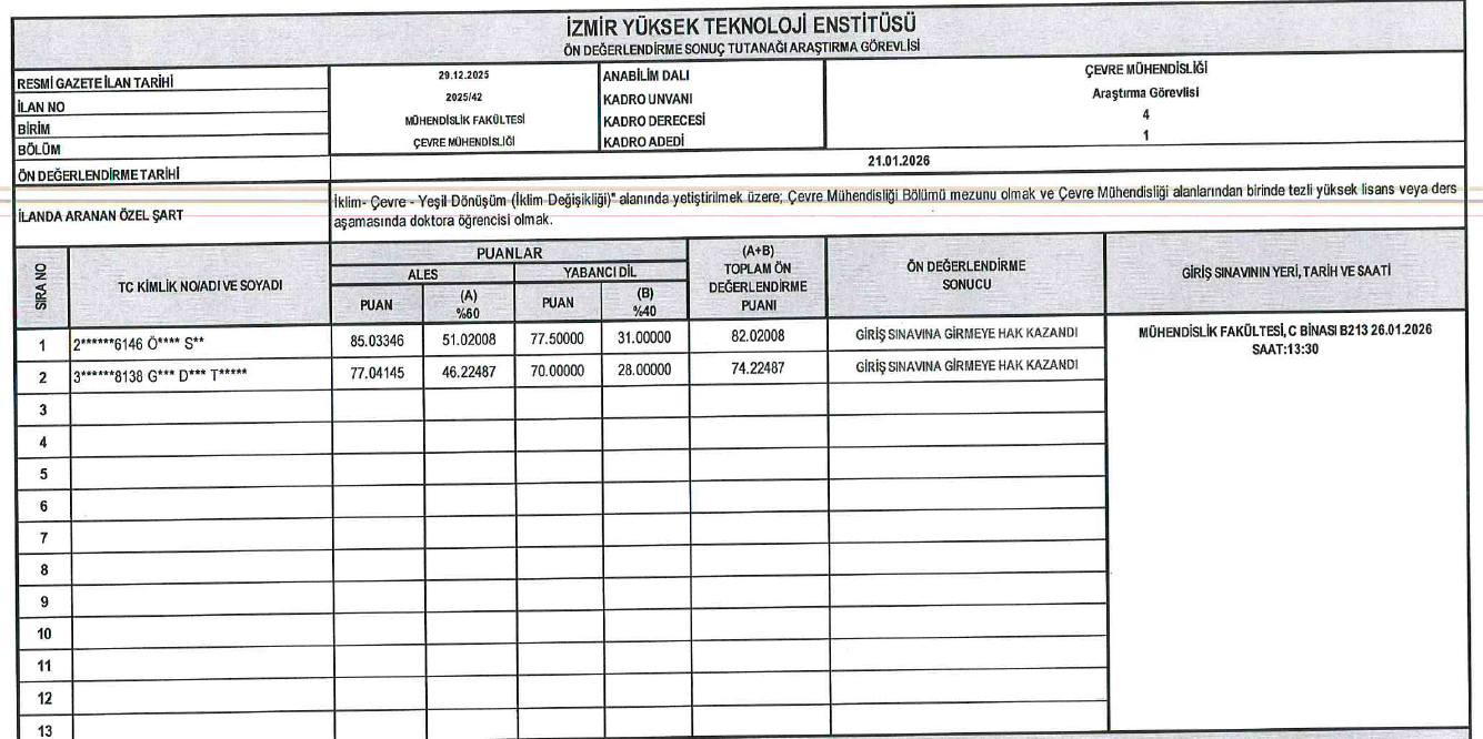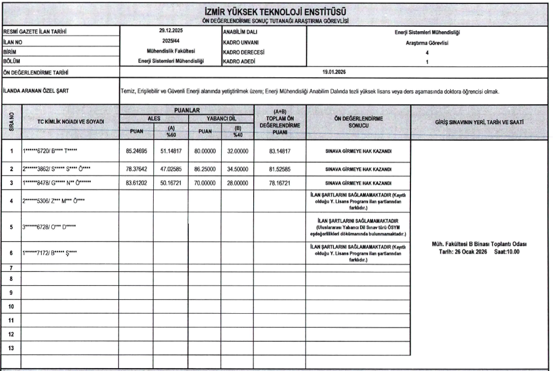 29.12.2025 tarih ve 33122 sayılı Resmi Gazete’de yayınlanan ilan doğrultusunda Enstitümüzün ilanda belirtilen birimlerine 2547 sayılı Kanun’un ilgili maddeleri ve “Öğretim Üyesi Dışındaki Öğretim Elemanı Kadrolarına Yapılacak Atamalarda Uygulanacak Merkezi Sınav ile Giriş Sınavlarına İlişkin Usul ve Esaslar Hakkında Yönetmelik” hükümleri doğrultusunda alınacak olan Araştırma Görevlisi Kadroları için ön değerlendirme sonuçlarına aşağıdaki bağlantıdan ulaşabilirsiniz.