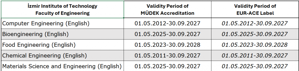 The MUDEK accreditation process in our Faculty began in 2010 with the Department of Chemical Engineering. As of July 1, 2025, the undergraduate programs of the Departments of Computer Engineering, Chemical Engineering, Bioengineering, Food Engineering, and Materials Science and Engineering are accredited by MUDEK.