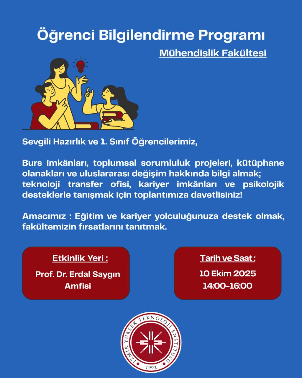Program kapsamında, Toplumsal Sorumluluk Projeleri Koordinatörlüğü, Uluslararası İlişkiler Ofisi, Eğitim Burs Ofisi Koordinatörlüğü, Kariyer Ofisi Koordinatörlüğü, Teknoloji Transfer Ofisi, İZTEK A.Ş. Genel Müdürlüğü, Kütüphane ve Dokümantasyon Daire Başkanlığı ile Sağlık, Kültür ve Spor Daire Başkanlığı temsilcileri tarafından gerçekleştirilen sunumlarda, öğrencilere eğitim ve kariyer yolculuklarında faydalanabilecekleri çeşitli fırsatlar tanıtıldı.