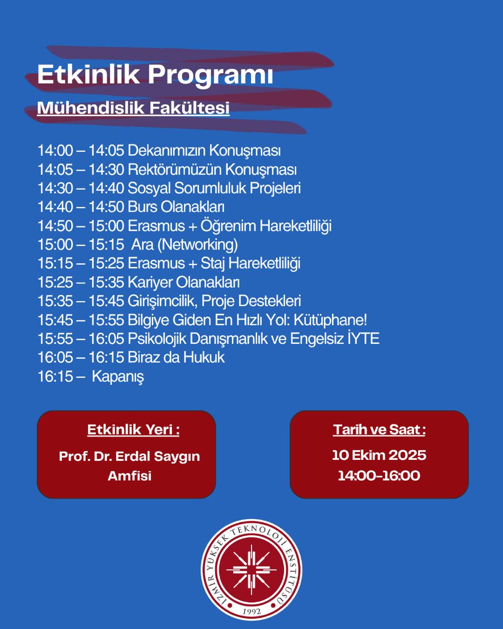 Etkinliğin açılış konuşmasını yapan Mühendislik Fakültesi Dekanı Prof. Dr. Mehmet POLAT, İYTE’nin öğrencilere sunduğu çok yönlü imkânlardan yararlanmanın önemini vurgulayarak, mühendislik öğrencilerini fakülte faaliyetlerine aktif katılım göstermeye davet etti.
